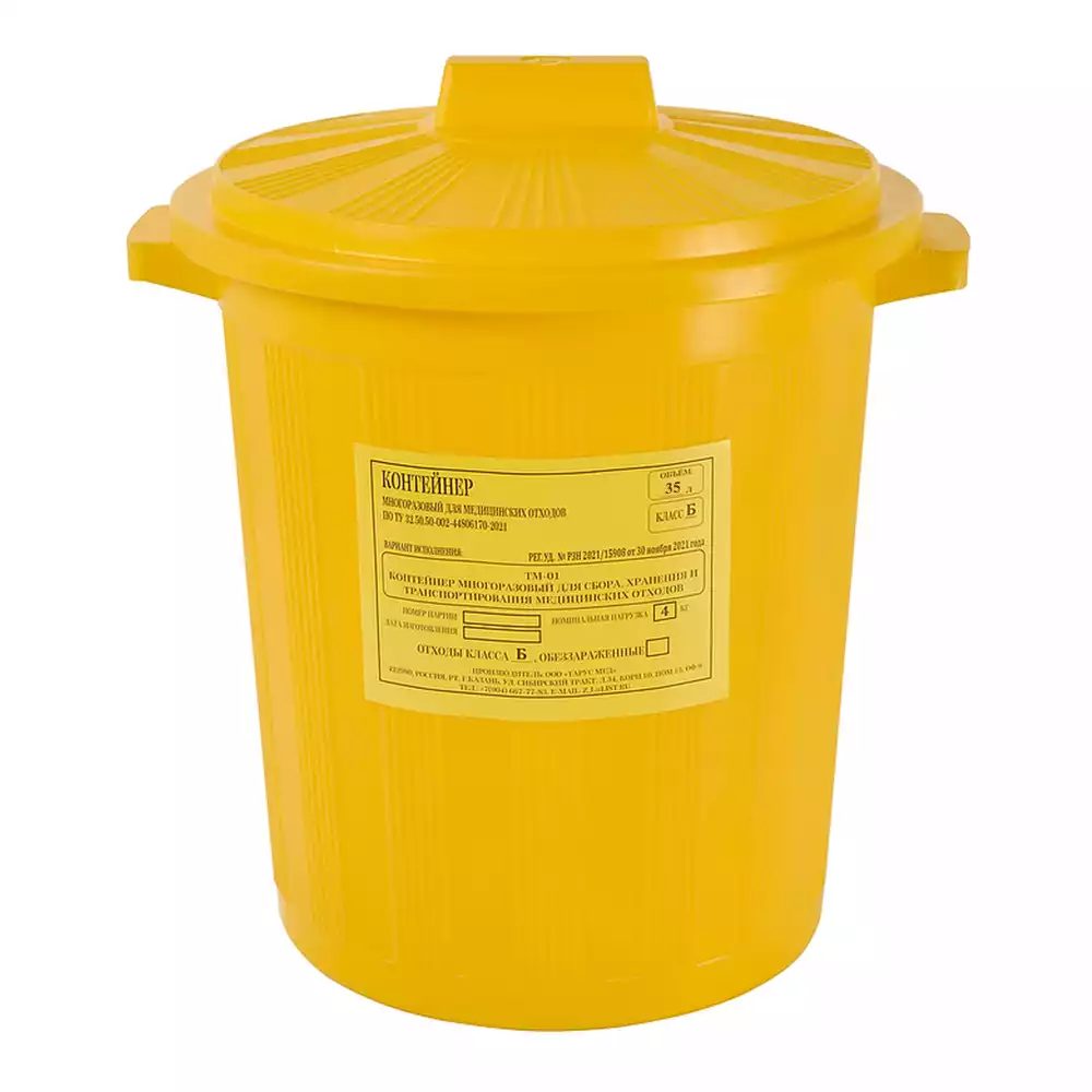 Бак 20,0л ТМ-01 для сбора, хранения медицинских отходов (класс Б), с крышкой сверху, цвет желтый, многоразовый, Тарус Медикал (РОССИЯ)