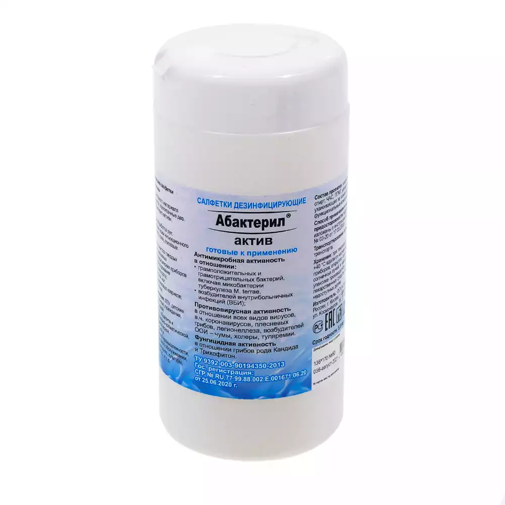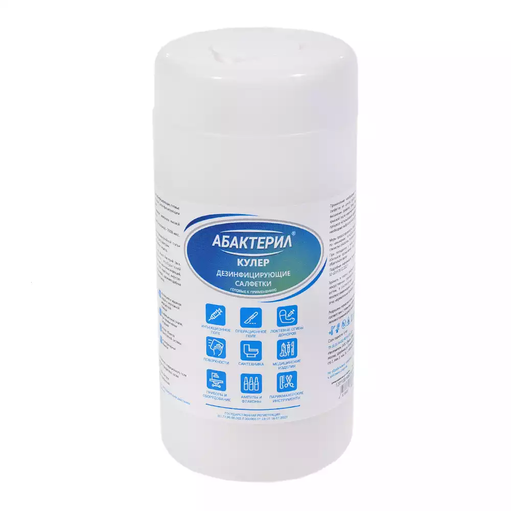 Салфетки "Абактерил - Кулер", дезинфицирующие, размер 12*18см, банка 60шт, готовые к применению, Рудез (РОССИЯ)