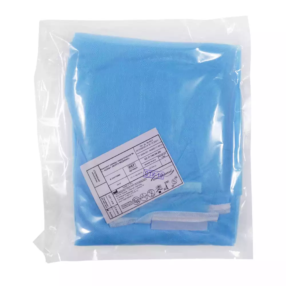 Халат хирургический ЕВРО, длина 140см, материал СМС 42г/м2, размер 58-60, стерильный, Волга Медикал НПП (РОССИЯ)