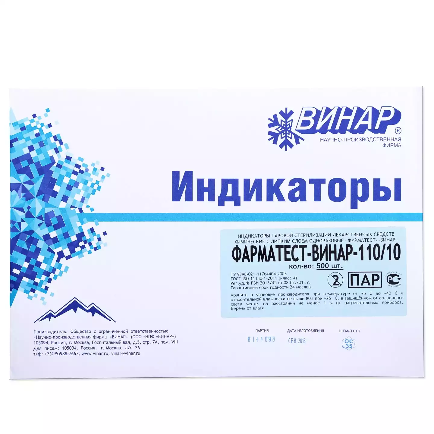Индикатор стерилизации ФАРМАТЕСТ 100/10, класс 4, упаковка 500шт, без журнала, Винар НПФ (РОССИЯ)