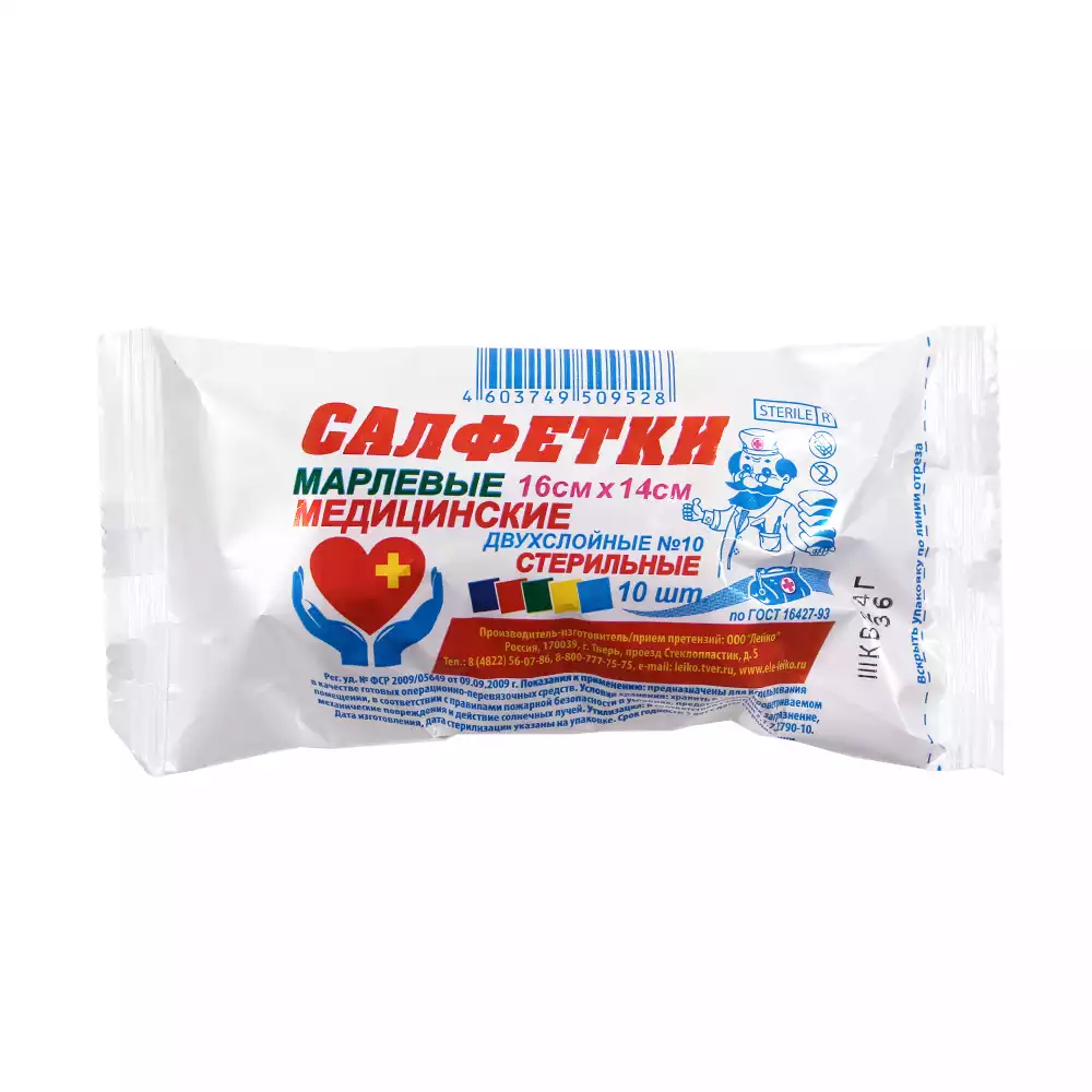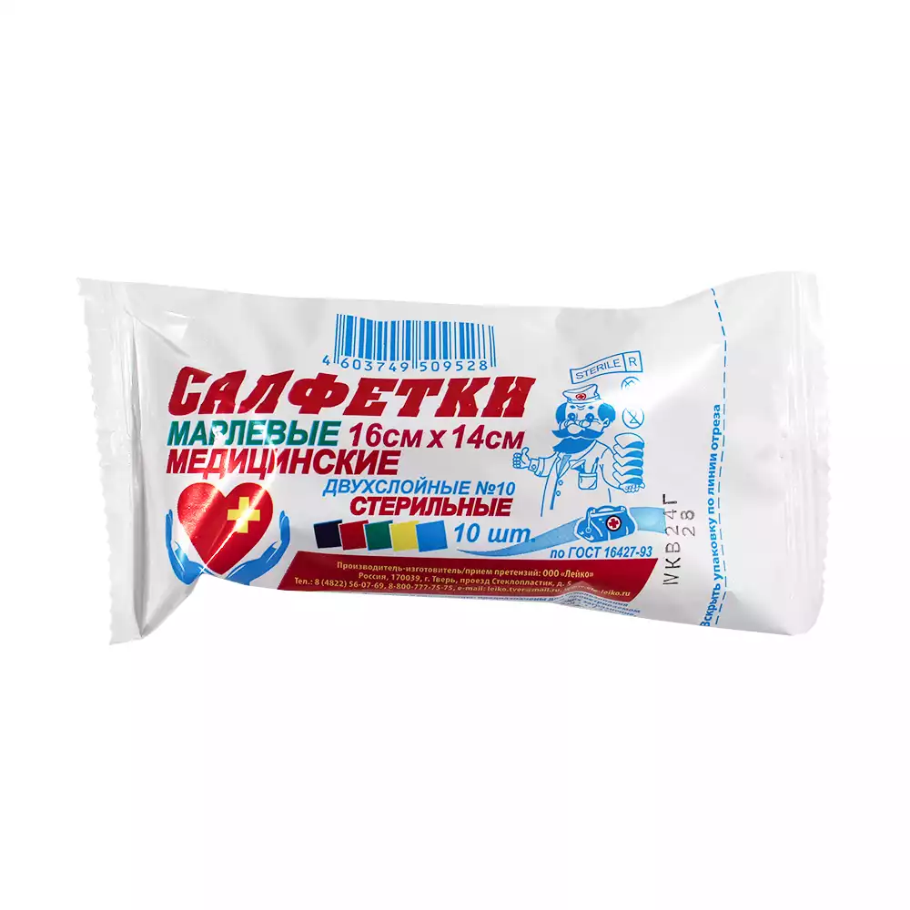 Салфетка марлевая №10, 2-х слойная, размер 16*14см Лейко, плотность 28г/м2, стерильная, Лейко (РОССИЯ)