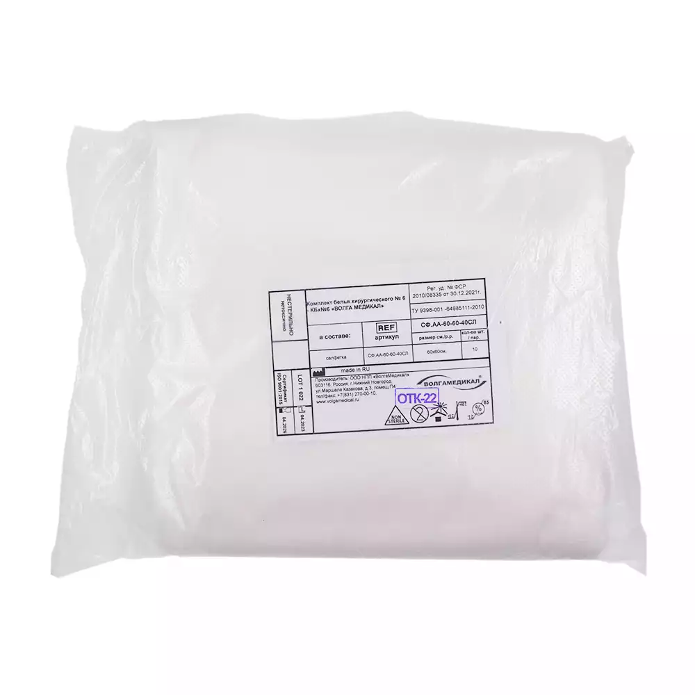 Салфетка 60*60см, материал спанлейс 40г/м2, нестерильная, белая, Волга Медикал НПП (РОССИЯ)