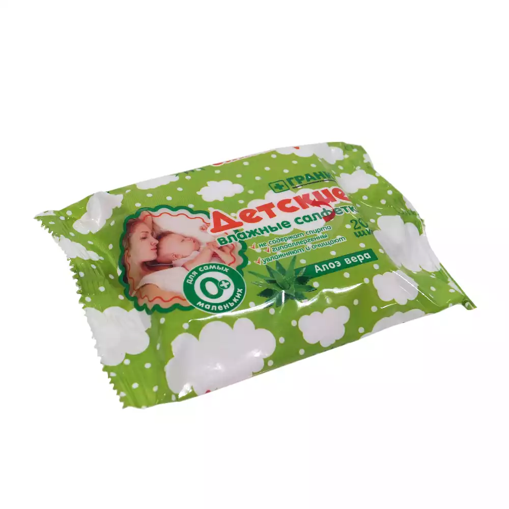 Салфетки влажные с Алоэ Вера, детские, гигиенические, не содержат спирта, размер 15*15см, упаковка 20шт, Грани (РОССИЯ)
