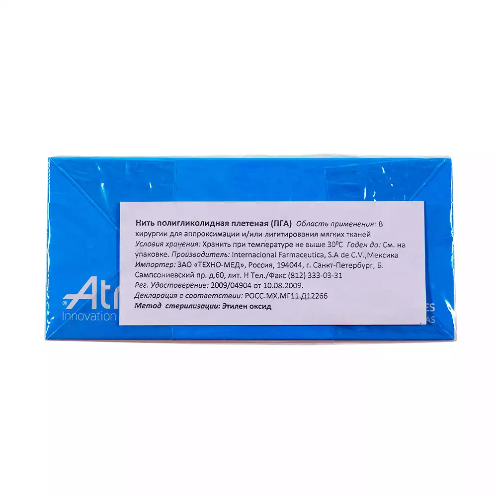 Хирургический шовный материал КИСЛОТА ПОЛИГЛИКОЛЕВАЯ (PGA) ATRAMAT® является плетёным стерильным рассасывающимся (путем гидролиза) материалом, состоящим из гомополимеризованных филаментов гликолевой кислоты.