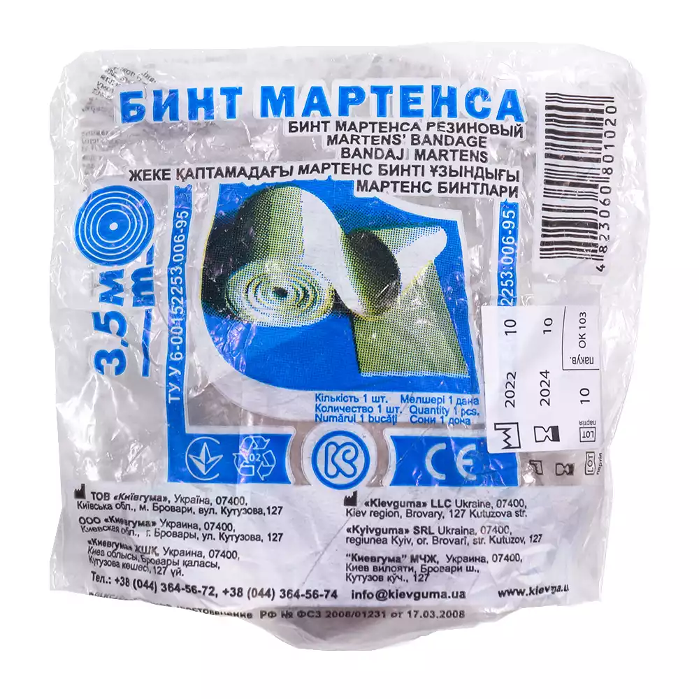 Бинт резиновый Мартенса - предназначен для применения в медицинской практике для фиксации шин и повязок: в травматологии, медицинских учреждениях, в военно-полевых условиях, в быту. Изготавливается из резиновой смеси на основе СКИ (Синтетический Каучук Изопреновый), разрешенной к применению органами здравоохранения РФ, имеет вид полоски резинового полотна скрученного в рулон. Бинт Мартенса - эластичен и безопасен в эксплуатации для здоровья человека, применяется многократно. Устойчив к пятикратной дезинфекции. Размеры: