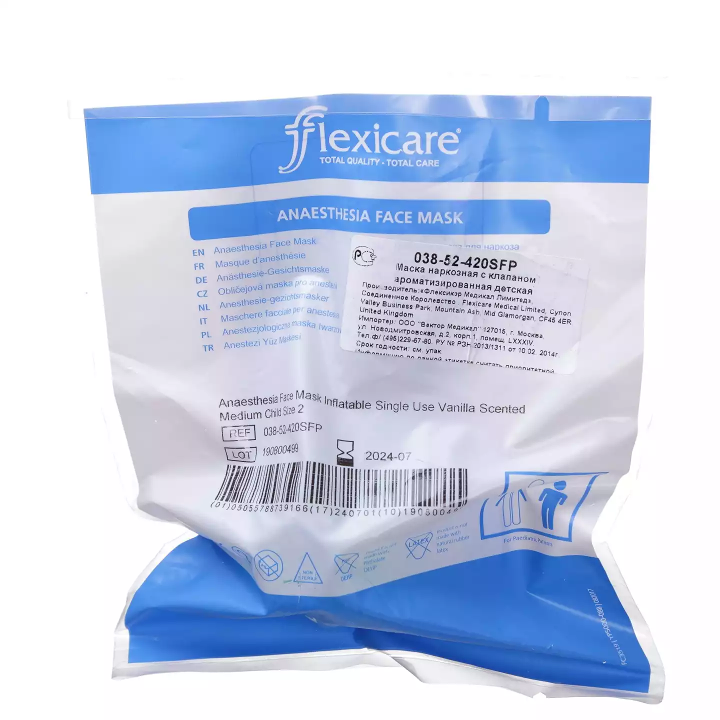 Маска анестезиологическая ароматизированная "Ваниль" с поддувной манжетой и цветоиндикаторным кольцом маскодержателя (зеленый) детская, размер 2. Удлиненная конусообразная форма; сверхмягкая гипоаллергенная полностью прозрачная манжета и тело маски, включая место присоединения манжеты; легкоснимаемое кольцо для фиксирующих устройств; ниппельный клапан для раздувания манжеты; наружный диаметр отверстия маски 22мм.