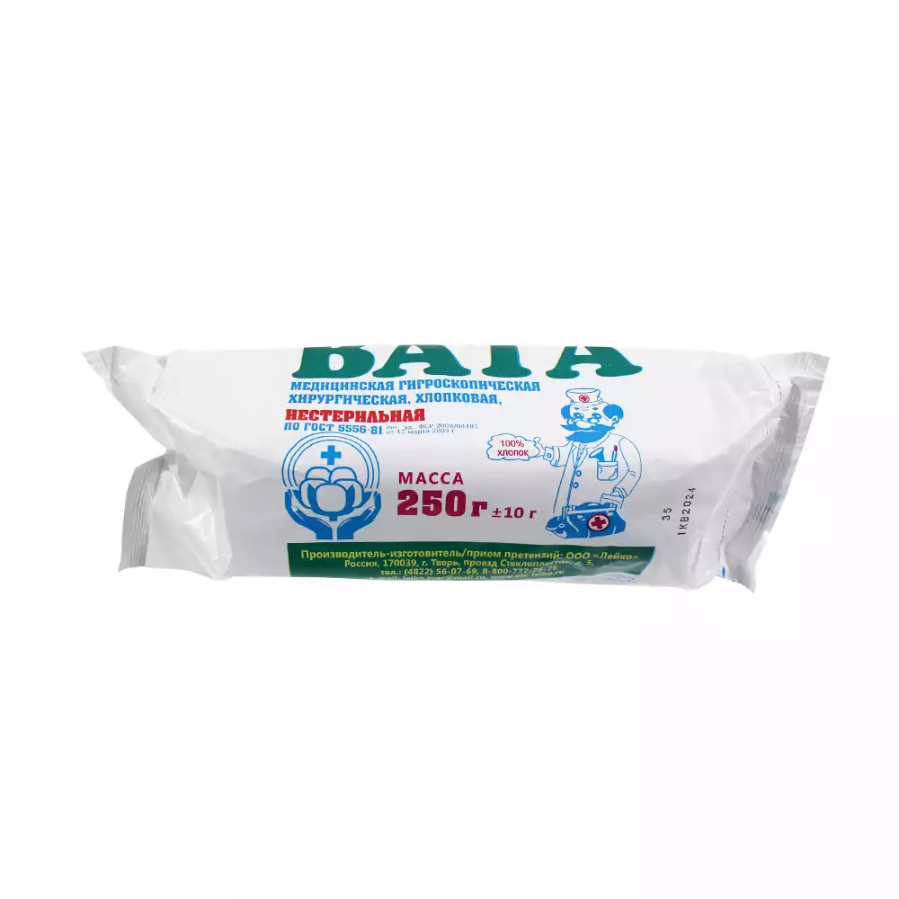 Вата медицинская хирургическая 250 гр. нестерильная, используется в медицинских и гигиенических целях, производится из натурального длинноволокнистого сырья (волокна 100% хлопка высшей пробы) без добавления добавок и примесей.